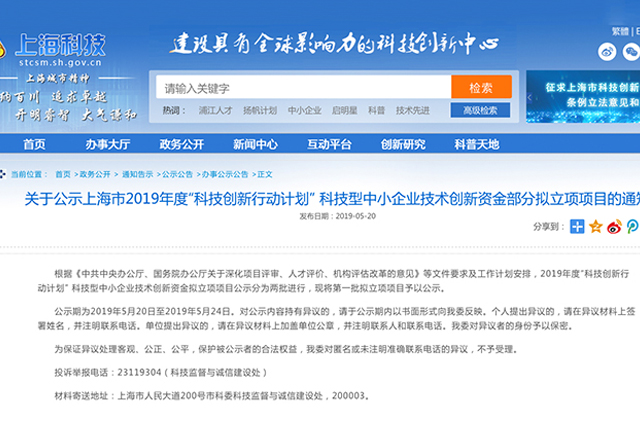 钹特获得上海市2019年度“科技创新行动计划” 科技型中小企业技术创新资金立项公示