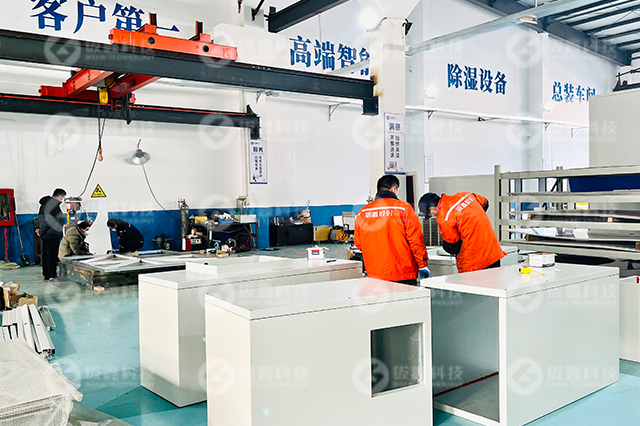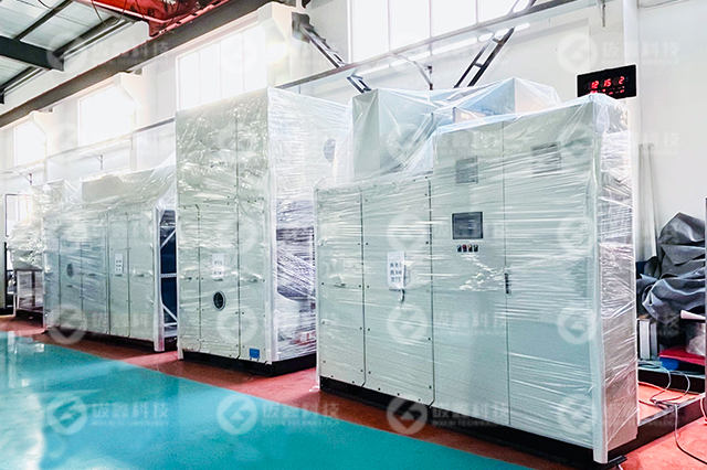 此次项目,运用于锂电池生产线,其使用环境温度22℃±3℃,露点温度:-45℃~-60℃。设备采用全焊接结构,密封性更高保证了房间低湿度和露点要求,极大的满足客户生产环节的工艺要求。箱体内板采用高度防腐性的覆铝锌钢板和喷塑板,箱板内部采用优质的耐高温材料,具有良好的防火性和保温性能。除湿机组设计采用最优的节能和高效的模块化设计,采用更合理的控制系统,保证在极端低温和高温故障频次,能在极端工况下正常保持运行满足客户的生产需要。